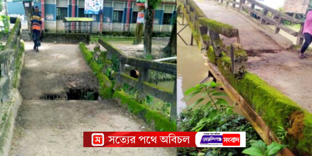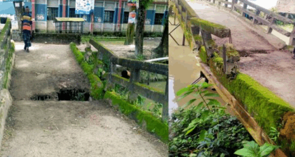 বরিশালের মেহেন্দীগঞ্জে একতা ডিগ্রি কলেজ-সংলগ্ন লোহার সেতু ভেঙে ঝুঁকিপূর্ণ হয়ে পড়েছে। দীর্ঘদিনের পুরোনো সেতুতে বড় ধরনের গর্ত হওয়ায় জোড়াতালি দিয়ে চলাচল করছে স্কুল-কলেজের শিক্ষার্থীসহ স্থানীয় বাসিন্দারা। গাড়ি চলাচল করতে না পারায় দুর্ভোগে পড়েছে উপজেলার লতা ও আন্ধারমানিক ইউনিয়নের সাত গ্রামের মানুষ। দ্রুত সেতুটি ভেঙে নতুন ঢালাই সেতু নির্মাণের দাবি জানিয়েছেন তারা।