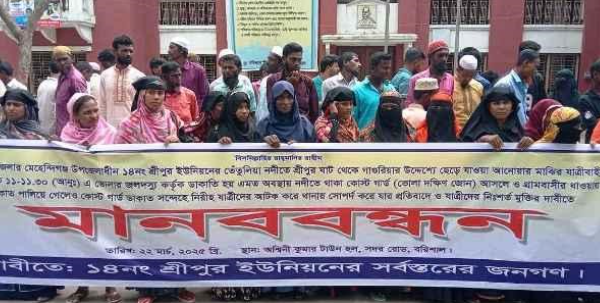 নিজস্ব প্রতিবেদক // বরিশালের মেহেন্দিগঞ্জের তেতুলিয়া নদীতে ডাকাত সন্দেহে গ্রেফতার ৬ ব্যক্তিকে ট্রলারের যাত্রী দাবি করে তাদের মুক্তি চেয়ে মানববন্ধন করেছে এলাকাবাসী। শনিবার (২২ মার্চ) দুপুরে বরিশাল নগরীর অশ্বিনী কুমার হলের