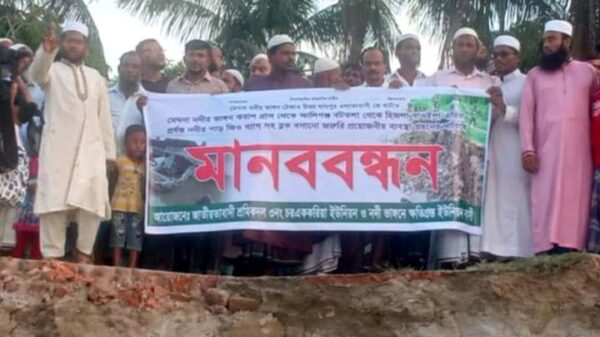 মেঘনার ভাঙ্গনের করাল গ্রাস থেকে বাঁচতে মেঘনার তীরে মানববন্ধন করেছে এলাকাবাসী
