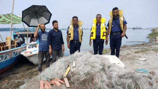 মেহেন্দীগঞ্জে নদীতে যৌথ অভিযান,১৬ মন জাটকা জব্দ, ৯৭ হাজার মিটার কারেন্ট জাল আগুনে ধ্বংস